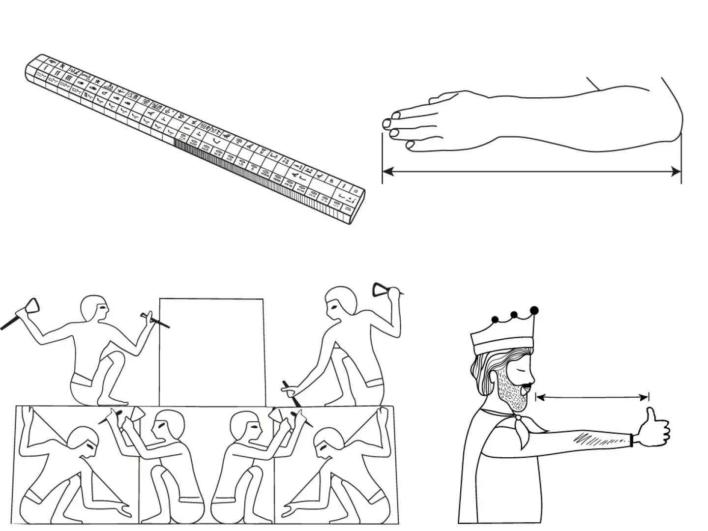 Już w starożytności zdawano sobie sprawę z tego, że poprawne pomiary różnych wielkości dają nieocenioną wiedzę i pozwalają tworzyć bardzo zaawansowane konstrukcje. Piramidy egipskie są tu przykładem sztandarowym. Znajdujemy w nich rysunki świadczące o istotności metrologii w pracach budowlanych, a nawet świadectwo istnienia czegoś, co dziś nazwalibyśmy kontrolą czynną, czyli kontrolą pomiarów w trakcie wykonywania. Z tamtych czasów wywodzą się również pierwsze wzorce długości, np. łokieć przedstawiony na rys. 1.