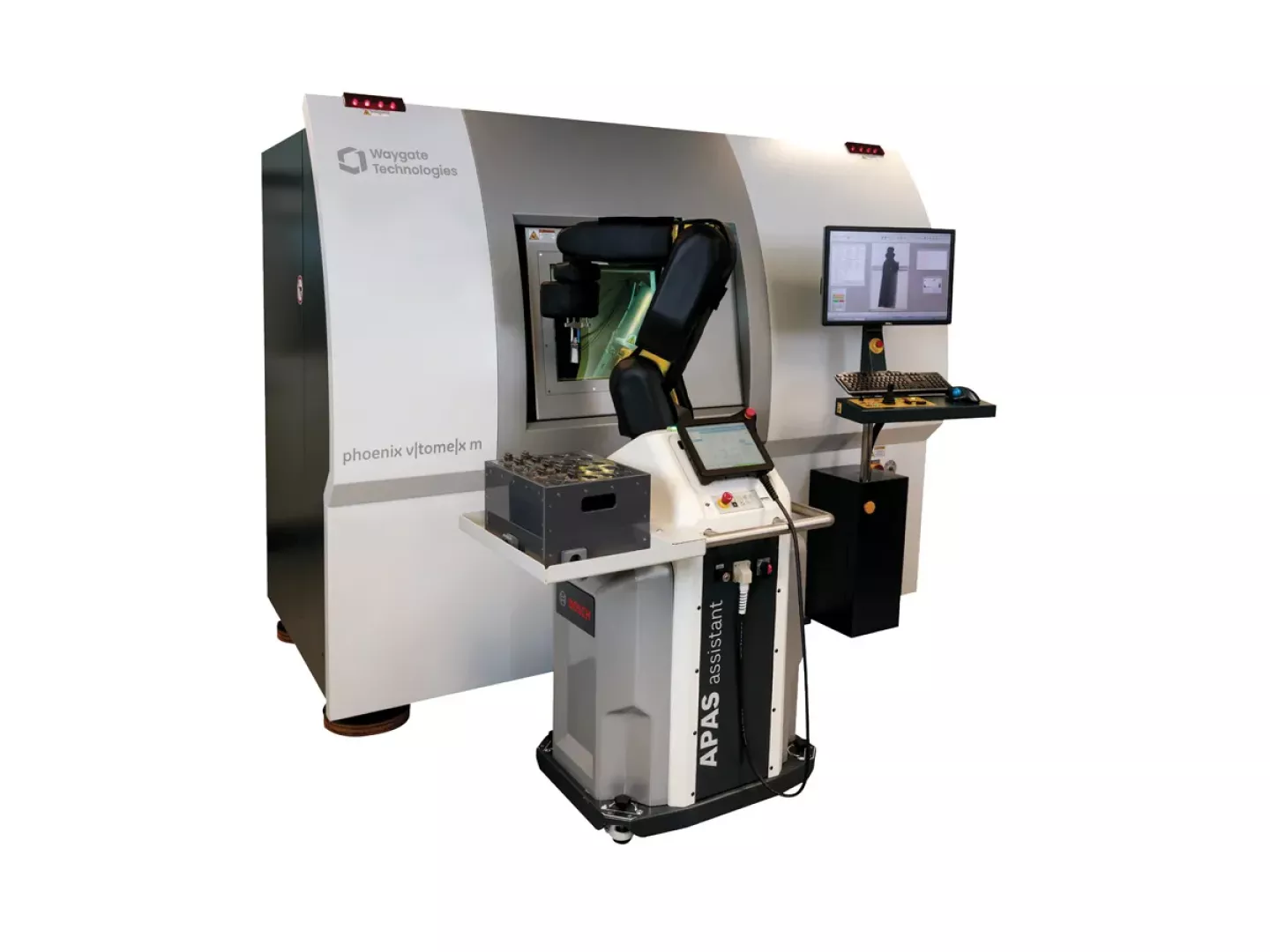 Ponadto dla celów metrologicznych wymagane jest zapewnienie we wnętrzu odpowiednio stabilnych warunków termicznych. Wygląd takiego tomografu wraz z robotem podającym i odbierającym mierzone przedmioty pokazano na rys. 14. Koboty i roboty (jak ten przedstawiony na rys. 14) stają się w Metrologii 4.0 codziennością. Ich wykorzystanie pozwala coraz bardziej uniezależnić się od człowieka, jako niestety najbardziej nieprzewidywalnego elementu procesu pomiarowego. Operator jest także z punktu widzenia zjawisk cieplnych bardzo istotnym elementem wpływającym na niepewność pomiaru. To również sprawia, że przyszłość systemów pomiarowych kojarzona jest z rosnącą automatyzacją.