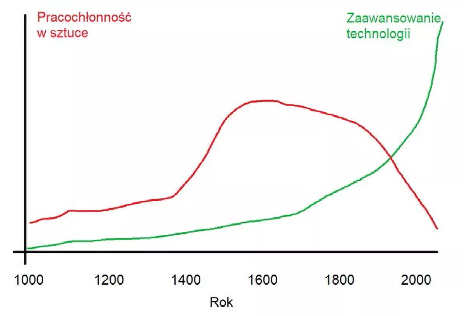 Strategia ta – według inicjatorów – jest odpowiedzią na problemy współczesnego przemysłu, m.in.: brak rąk do pracy (mały przyrost naturalny w krajach rozwiniętych), niedobór wykwalifikowanej kadry i rosnące wymagania ekologiczne. A zatem czwarta rewolucja jest zupełnie inna niż trzy poprzednie: zmienia nie tylko to, co i jak robimy, ale także to, kim jesteśmy. Zmienia podejście inżynierskie, zależności biznesowe, ekonomiczne i społeczne. Przez to dotyczy nie tylko maszyn i systemów, ale obejmuje wszystkie aspekty życia i nauki. Jak w tym współczesnym świecie odnajdzie się inżynier? Zdecydowanie w cenie coraz bardziej będzie wiedza multidyscyplinarna. Dla osób patrzących z zewnątrz wiele naszych działań pozostanie nawet nie tyle w sferze wiedzy i nauki, ile, patrząc z punktu widzenia efektów, w sferze artyzmu, a nawet magii. Dobrze odzwierciedla to wykres na rys. 3 porównujący wkład pracy artysty i inżyniera w swoje dzieła poprzez wieki. Prawda, że interesujący? No cóż, sam go opracowałem jakieś dwa lata temu... Chyba wyraźnie się starzeję, skoro filozofowanie na temat nauki zaczyna mi sprawiać pewną przyjemność... Takie wydają się obecnie wyzwania współczesnego świata. A jak odnajduje się w nim metrologia? Dokąd zmierza, trzymając się nieustannego rozwoju i gdzie jest w tym wszystkim miejsce dla człowieka? Nieco starsi czytelnicy (czyli plus minus moi rówieśnicy) pamiętają z pewnością powiedzenie z lat słusznie minionych: jak w zakładzie z kimś nie ma co zrobić – to trzeba dać go do kontroli jakości, przerabiane pejoratywnie na: ślepy i głuchy? Do kontroli jakości. Sytuacja ta zmieniła się tak bardzo,