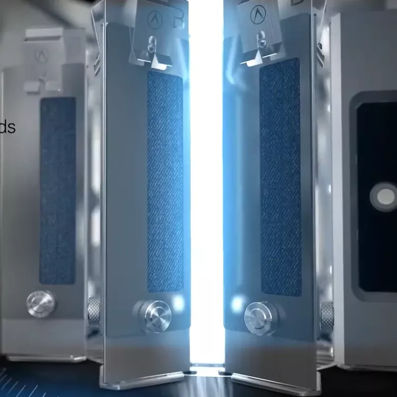 Urządzenie ma wysuwany zbiornik wody schowany za przednim panelem, z zasilaniem sieciowym lub ręcznym.