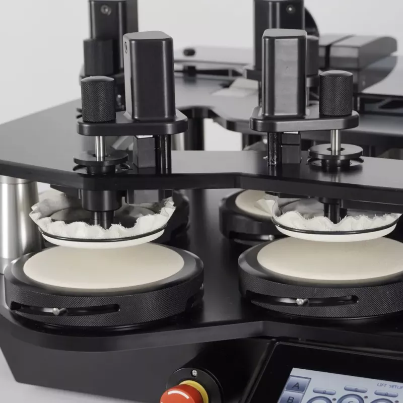 Precyzyjne pierścienie zaciskowe z aluminium lotniczego skracają czas montażu próbek. Uchylna pokrywa kołków napędowych ułatwia szybkie przechodzenie między pillingiem a ścieralnością
