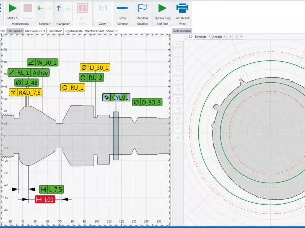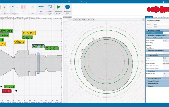 TOLARIS Optic pozwala zbudować plan pomiarowy poprzez wybór cech z listy i przeciągnięcie ich na kontur detalu, z pomocą kreatorów prowadzących użytkownika krok po kroku.