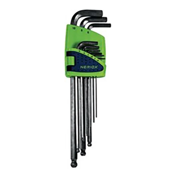 Zestaw długich kluczy imbusowych NERIOX spełniających normę ISO 2936 L zawiera 9 rozmiarów od 1,5 mm do 10 mm. Każdy klucz wykonany z chromowo-wanadowej stali, wykończony satynowo i wyposażony w kulową końcówkę („ball head”) na długim ramieniu, ułatwiającą dostęp do śrub pod kątem. Klucze dostarczane są w praktycznym plastikowym uchwycie.