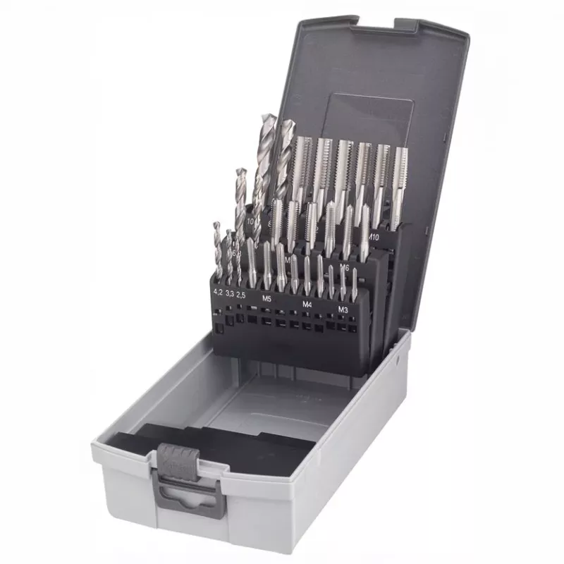 - 3-częściowe zestawy gwintowników ręcznych: M3, M4, M5, M6, M8, M10, M12