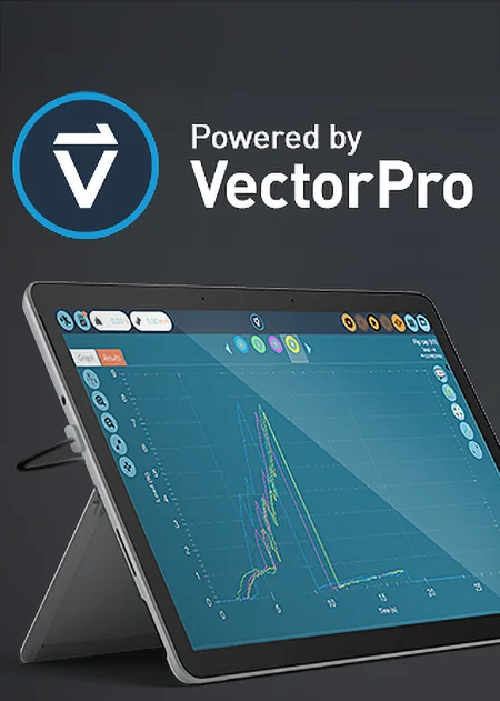 Urządzenie współpracuje z oprogramowaniem VectorPro, które pozwala na sterowanie testami, rejestrowanie i analizę danych (siły, przemieszczenia), tworzenie testów krok po kroku, definiowanie kryteriów Pass/Fail, generowanie raportów PDF, eksport danych do arkuszy kalkulacyjnych itp.