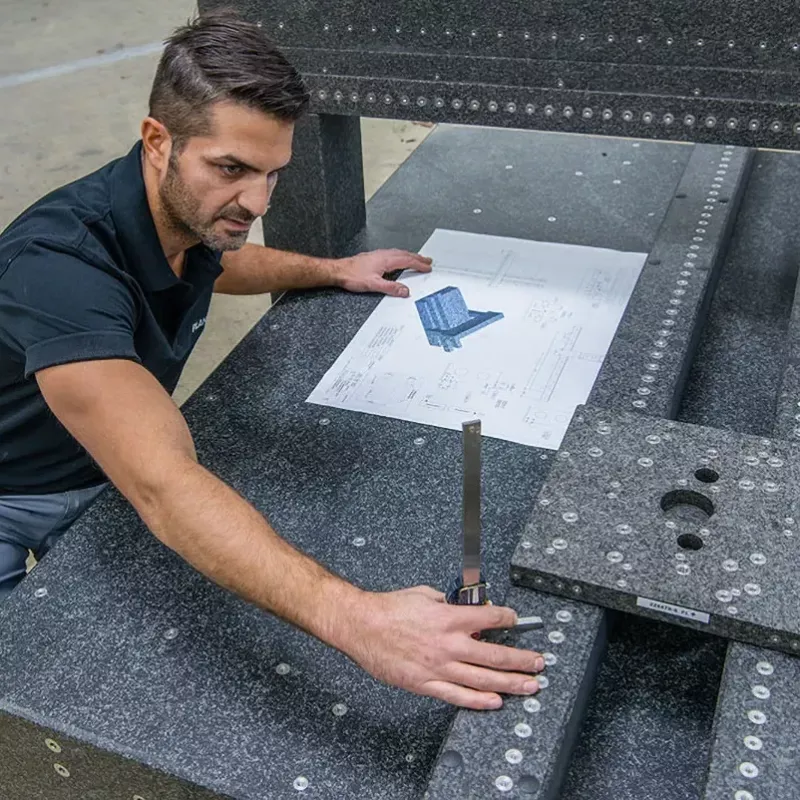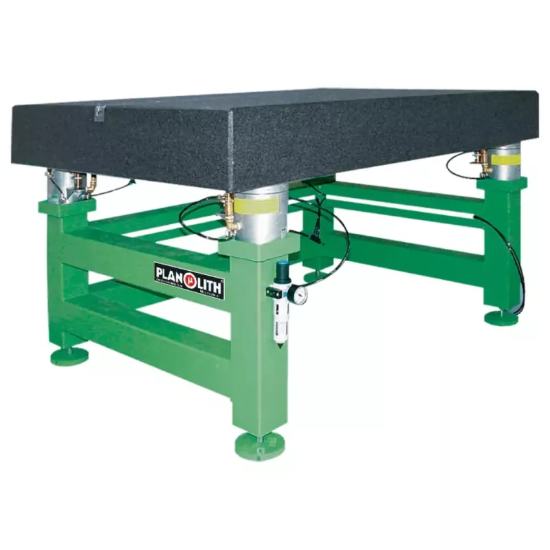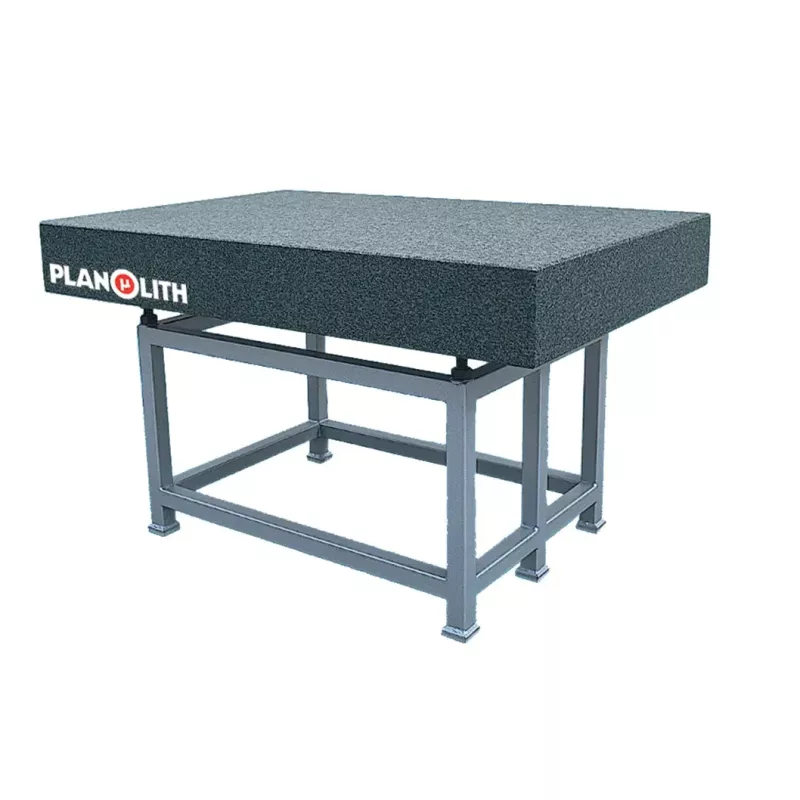 Płyta granitowa PLANOLITH na podstawie z izolacją drgań — stanowisko do kontroli gabarytów.