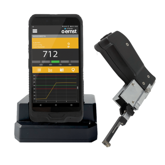 e‑Handy to kompaktowy, bezprzewodowy twardościomierz wykorzystujący opatentowaną metodę ESATEST® opartą na pomiarze oporu elektrycznego, stworzony z myślą o pomiarach w trudno dostępnych miejscach. Umożliwia pomiary na małych powierzchniach, wewnątrz elementów konstrukcyjnych, w strefach wpływu ciepła (HAZ) oraz na złożonych zespołach bez konieczności demontażu. Wyniki pomiaru dostępne są natychmiast, co pozwala na szybką ocenę stanu materiału.