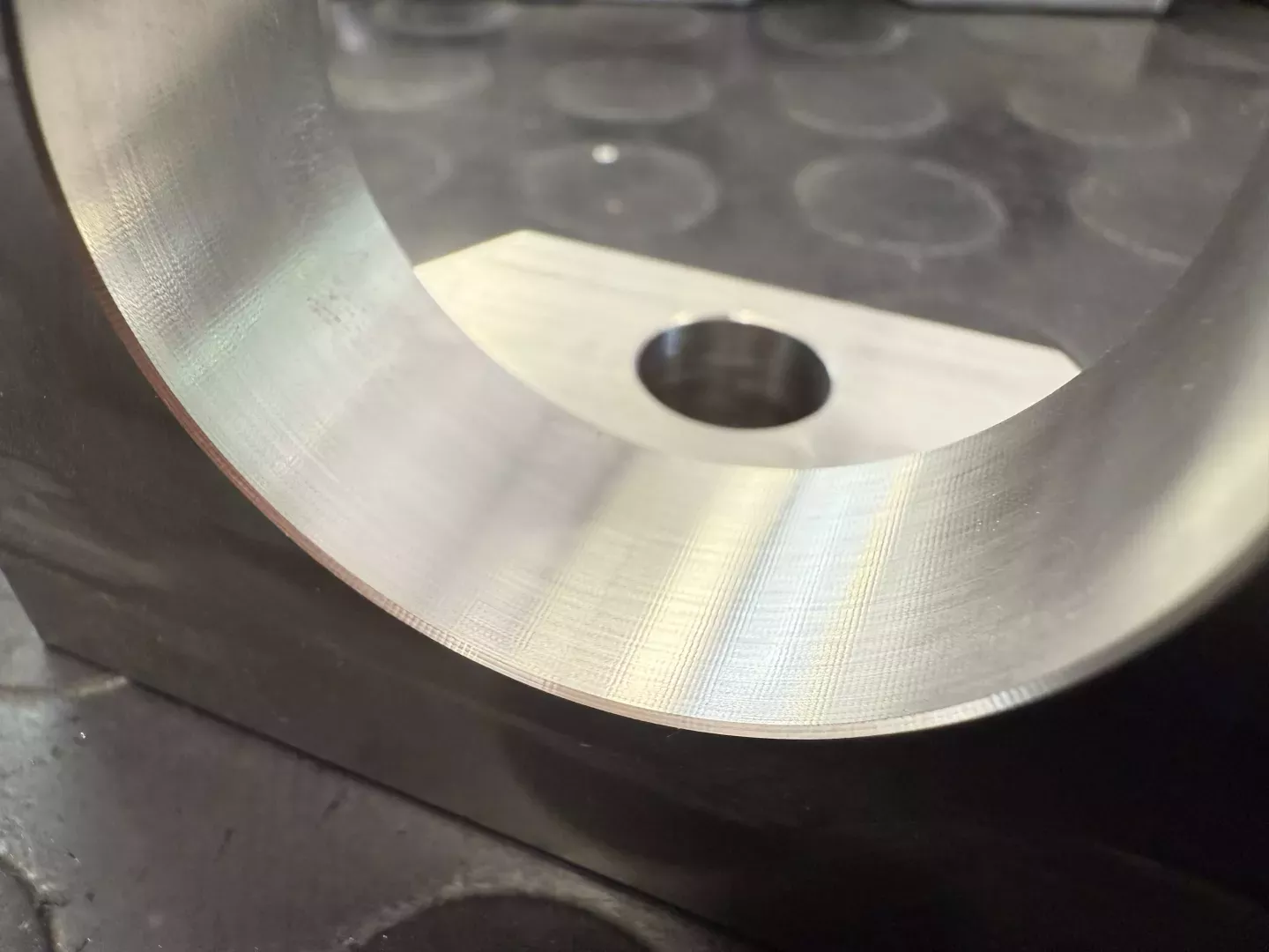 W czwartym mocowaniu szczególną uwagę zwrócono na dokładność otworu Ø40 H7. Element mocowano tak, aby uniknąć deformacji ścianki. Wykańczanie przeprowadzono frezem siedmioostrzowym Multicut XF Ø10 mm, pozostawiając 0,05 mm naddatku. Obróbkę wykonano w dwóch przejściach (n = 2387 obr./min, vc = 75 m/min, vf = 513 mm/min, ap = 18 mm), osiągając Ra ≈ 0,48 µm przy wymaganiu ≤ 1,6 µm.