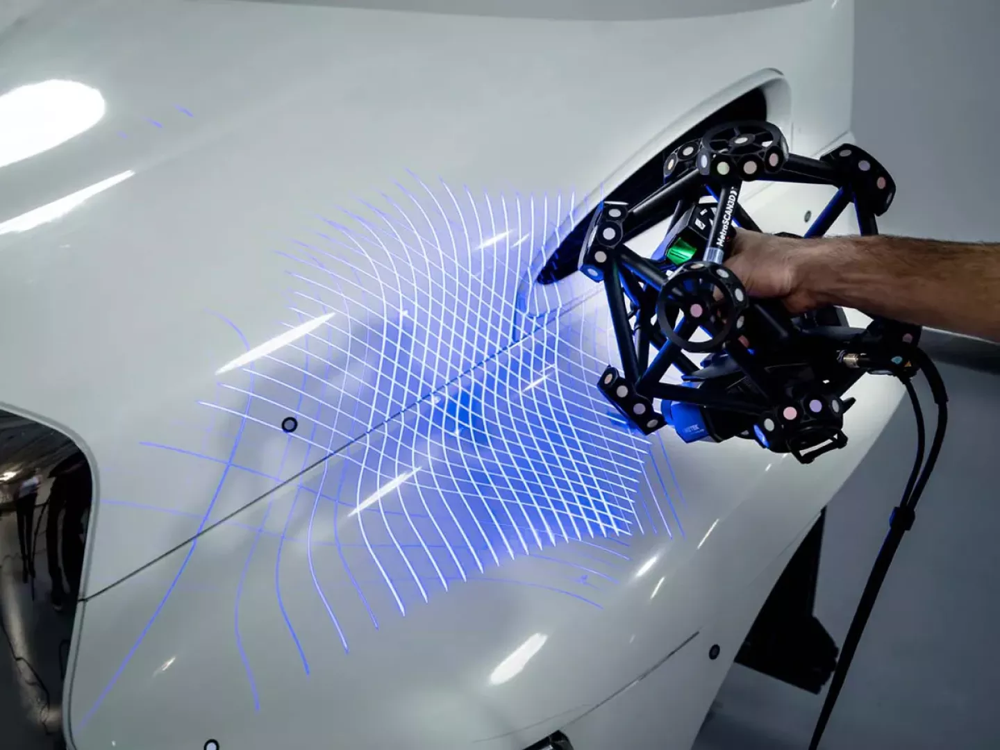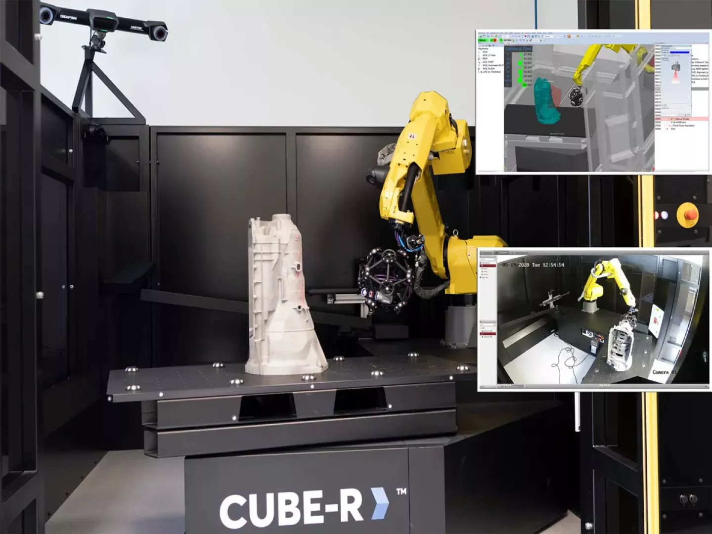 Zacznijmy od skanerów. Kilkanaście lat rozwoju spowodowało, że obecne konstrukcje są bardzo zaawansowane. Technologia skanowania laserowego wypiera światło strukturalne stosowane w poprzedniej generacji, dając – oprócz bardzo dobrych parametrów dokładnościowych – przede wszystkim rozwiązania niewymagające statywów i znikomą wrażliwość na zmianę refleksyjności oraz oświetlenie zewnętrzne. Od niedawna stosowane jest światło niebieskie (rys. 11). Skanery pracują również w wersji zrobotyzowanej (rys. 12). Przedstawiona koncepcja opiera się na skanerze zamocowanym na ramieniu robota i trackerze śledzącym jego położenie. Przedmiot zamocowany jest na stole obrotowym, dzięki czemu mamy dodatkową oś w całym systemie pomiarowym. Ponadto rozwiązanie to, w którego tworzeniu miałem przyjemność uczestniczyć, posiada zestaw kamer i oprogramowanie umożliwiające oddalonemu użytkownikowi na zdalny udział w procesie pomiarowym. Pomysł powstał przed pandemią, ale szczególnie w dzisiejszych czasach okazał się znakomitą opcją. Zlecający pomiary może obserwować ruchy na bieżąco, uzyskując informacje o mierzonych cechach na wyższym stopniu wtajemniczenia software’owego, może nawet ingerować w procedurę pomiaru [24]. Godne uwagi jest to, że całość została nominowana do nagrody Unii Europejskiej Regiostars.