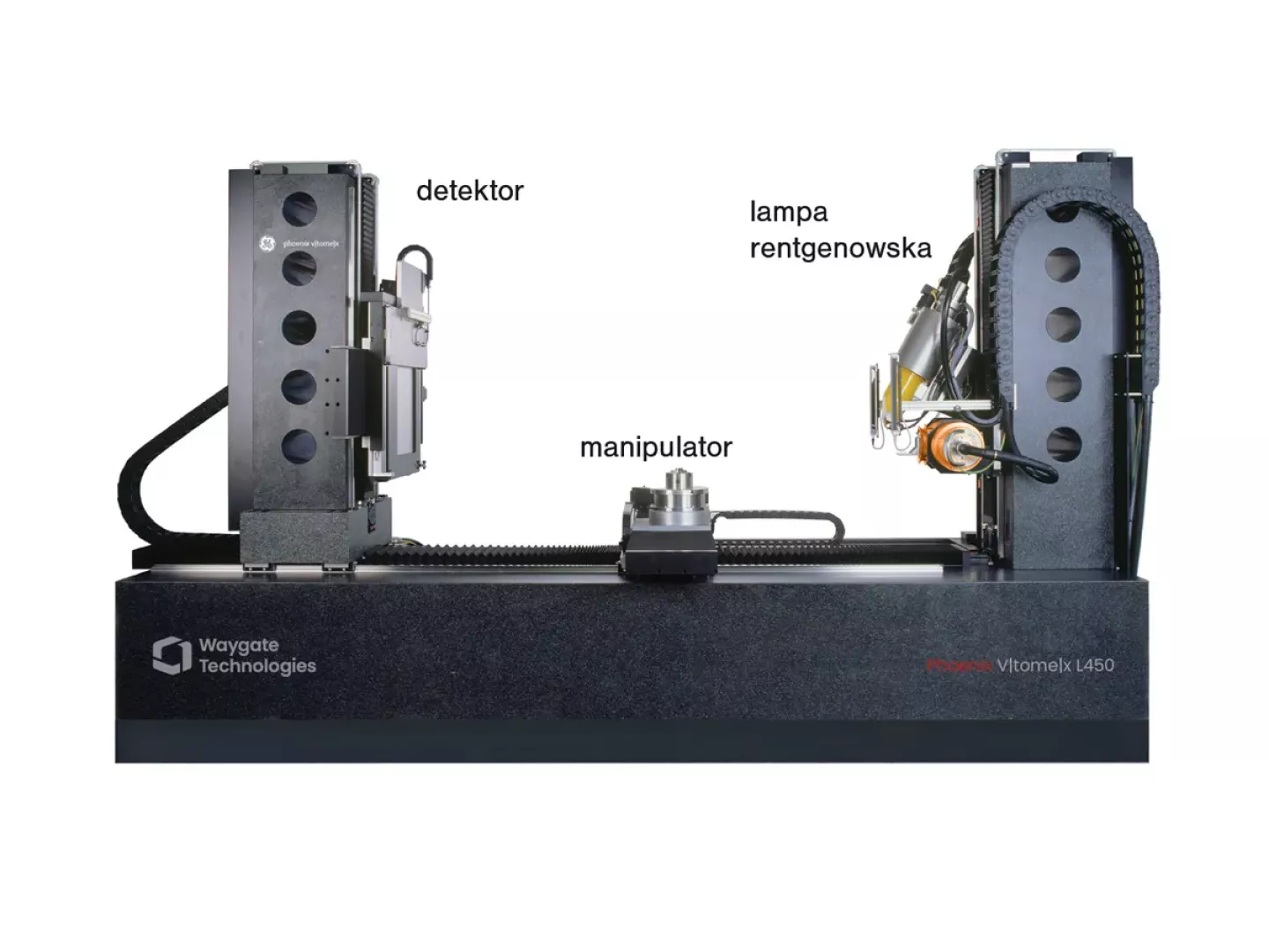 Tomografy techniczne oparte na promieniowaniu X to kolejne urządzenia współrzędnościowej techniki pomiarowej wkraczające do metrologii. Dzięki ich zastosowaniu możliwe jest nie tylko obrazowanie defektów w przedmiotach, ale także pomiary cech geometrycznych, nawet całkowicie niewidocznych [26]. Konstrukcja tomografu do zastosowań technicznych składa się z lampy, manipulatora z uchwytem do przedmiotu i detektora obrazu zamocowanych na wspólnej ramie (rys. 13) oraz oprogramowania do przygotowania i analizy danych pomiarowych. Tomograf musi jeszcze posiadać obudowę, zawierającą płyty ołowiane, pełniącą funkcję osłony przed promieniowaniem.