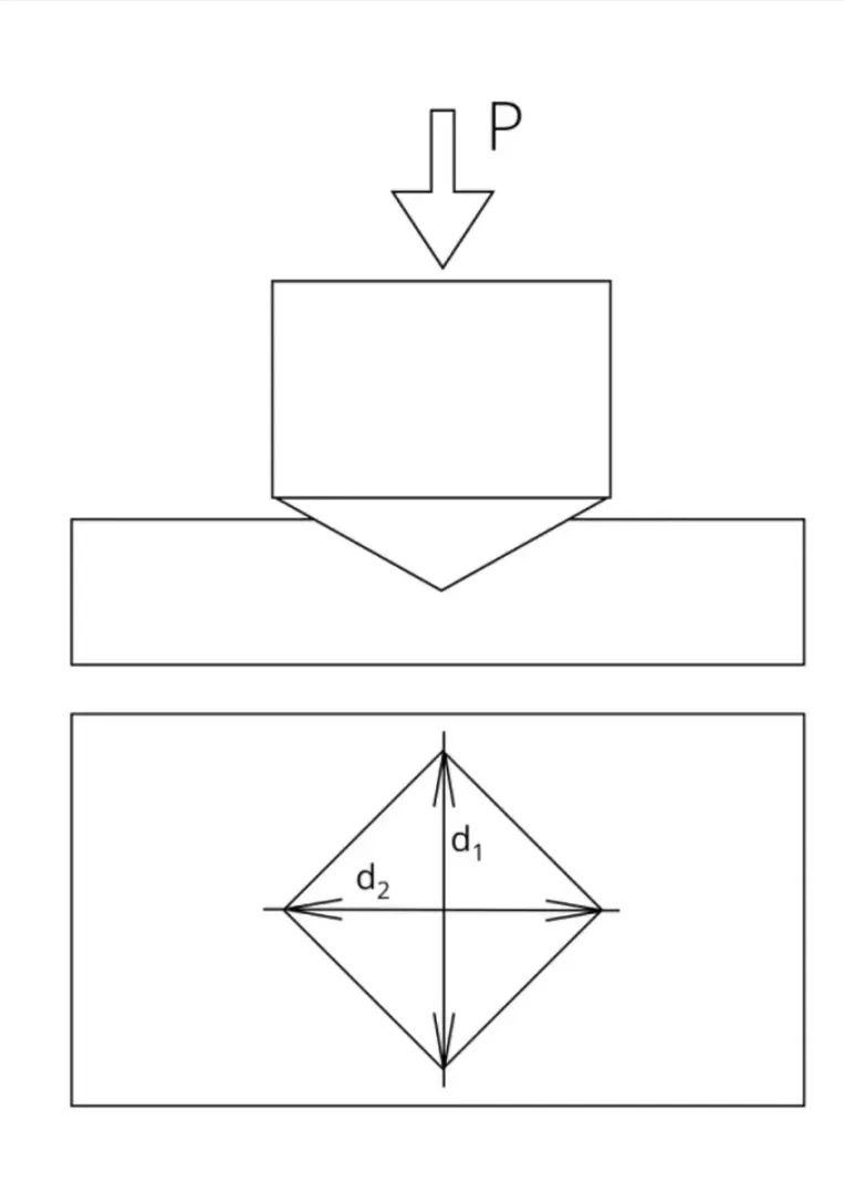 W badaniu stosuje się diamentowy wgłębnik – foremny ostrosłup o kącie wierzchołkowym 136°. Twardość wyznacza się jako stosunek przyłożonej siły do powierzchni podstawy odcisku. Kluczowe etapy: