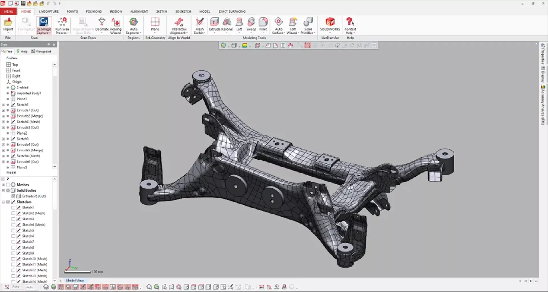 3. Model hybrydowy – połączenie powierzchniowego i parametrycznego sposobu projektowania. Zazwyczaj parametrycznie projektowane są powierzchnie współpracujące np. otwory czy płaszczyzny przylegania natomiast powierzchnie mniej istotne opisywane są za pomocą powierzchni NURBS. Jest to statystycznie najczęściej wykorzystywana metoda modelowania, która łączy w sobie zalety metody parametrycznej oraz powierzchniowej. Pozwala ona na uzyskanie najważniejszych elementów obiektu w postaci parametrycznych cech konstrukcyjnych, a jednocześnie zapewnia krótki czas przygotowania.