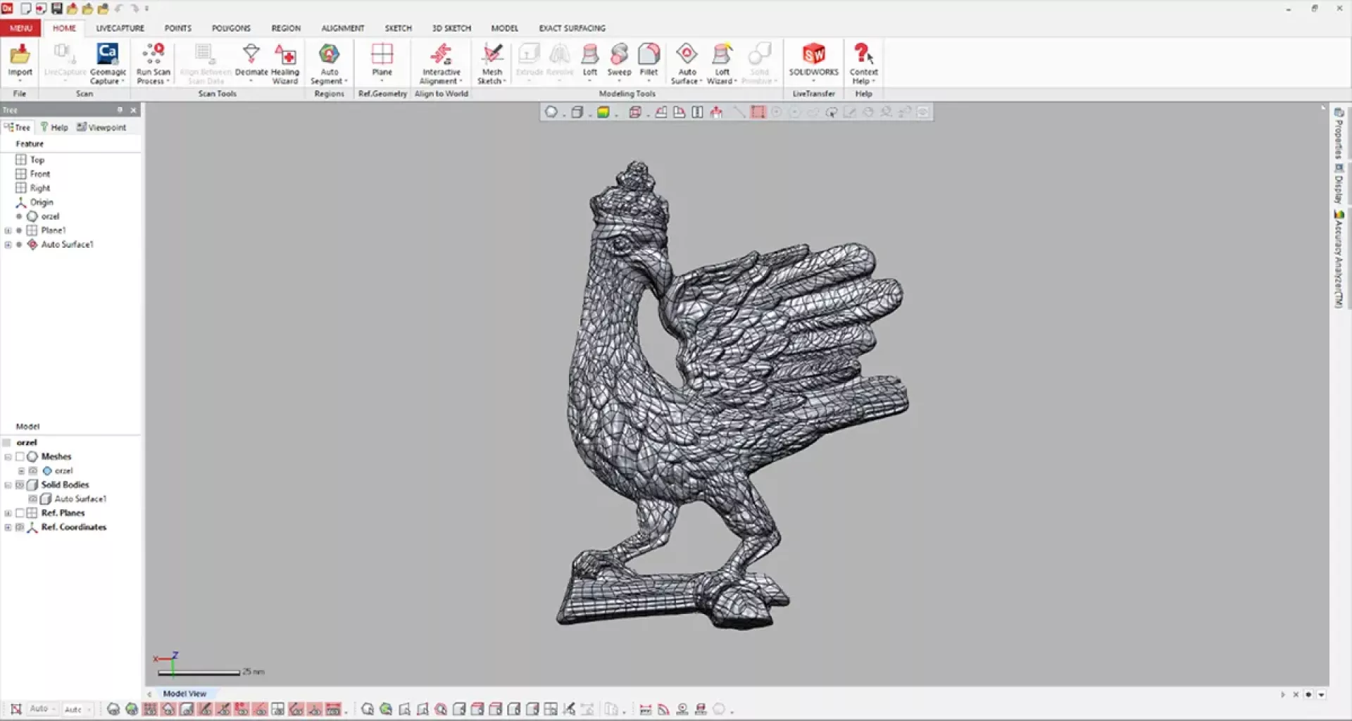 Drugim rodzajem usług jaki możemy Państwu zaoferować są realizacje procesu inżynierii odwrotnej na podstawie danych z procesu skanowania 3D powierzonego obiektu. Z otrzymanych ze skanera plików jesteśmy w stanie przygotować modele CAD 3D, dokumentację techniczną 2D, wizualizację obiektów, teksturowanie, złożenia całych zespołów czy modyfikacje istniejących konstrukcji. Pojęcie inżynierii odwrotnej jest bardzo szerokie i obejmuje wiele branż. Jako definicję możemy przyjąć, że jest to podejmowanie takich działań, aby zrozumieć, poznać jak dany obiekt, oprogramowanie, maszyna, część zespołu została zaprojektowana wraz ze wszystkimi niezbędnymi informacjami odnośnie materiału, sposobu wykonania czy montażu, które pozwolą na wierne odwzorowanie tego konkretnego obiektu. W przypadku inżynierii odwrotnej w aspekcie geometrii przedmiotów możliwe jest wykorzystanie bardzo dokładnej technologii odwzorowywania kształtów, czyli wspomnianego już skanowania 3D. Dzięki uzyskanej po skanowaniu siatce trójkątów możemy przejść do przygotowywania trójwymiarowego modelu CAD 3D. Wyróżniamy trzy metody przygotowania modeli CAD 3D: