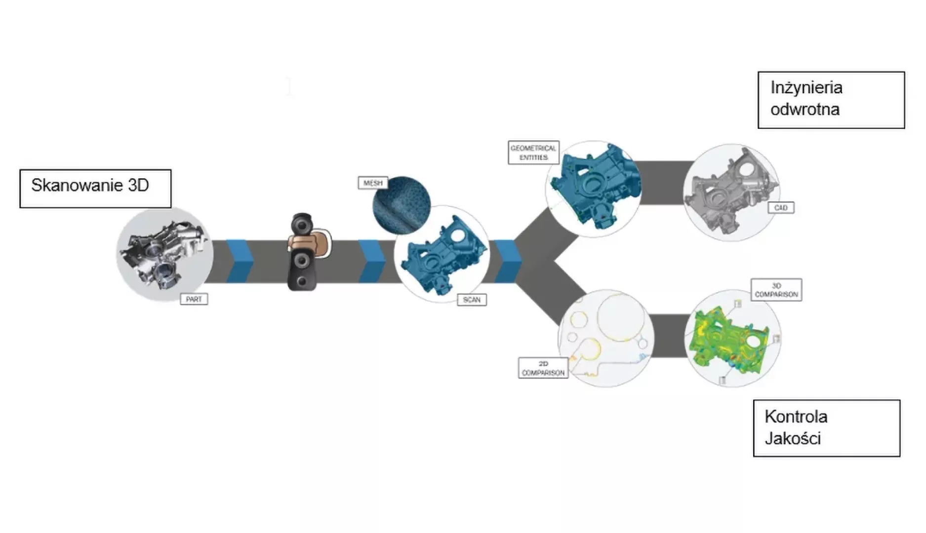 Zgodnie z przedstawionym na Rys.1 schematem procesu skanowania 3D oferujemy państwu dwa rodzaje usług. Pierwszym rodzajem są współrzędnościowe pomiary 3D obiektów o wymiarach od kilku milimetrów do nawet 20 m. W zależności od potrzeb i wymagań jesteśmy wstanie przygotować pełen raport pomiarowy składający się z pomiarów liniowych, pomiarów odchyłek kształtu i położenia (GD&T i GPS), porównania z modelem CAD w postaci kolorowej mapy odchyłek czy realizacją wirtualnego złożenia celem sprawdzenia występujących kolizji.