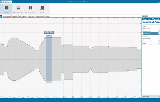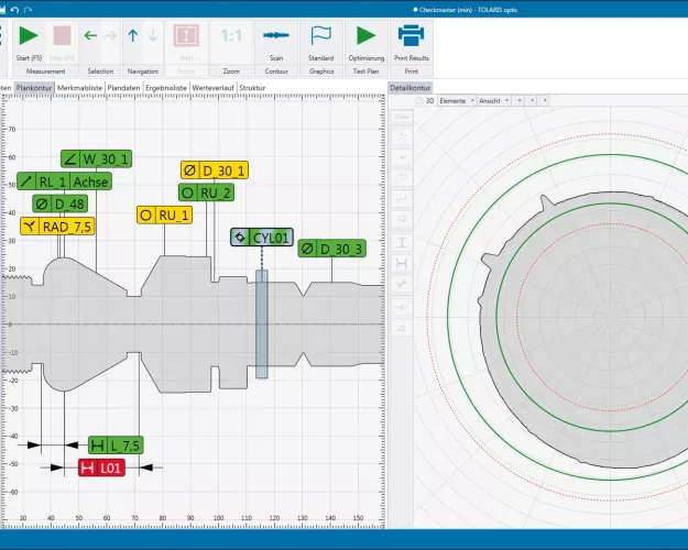 TOLARIS Optic pozwala zbudować plan pomiarowy poprzez wybór cech z listy i przeciągnięcie ich na kontur detalu, z pomocą kreatorów prowadzących użytkownika krok po kroku.