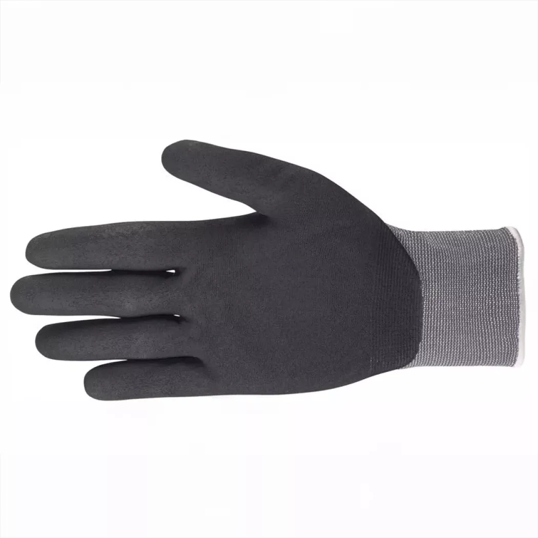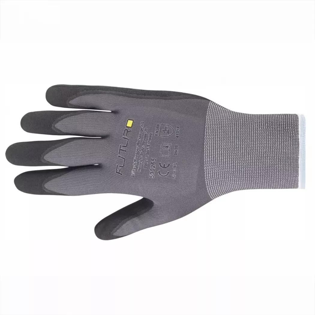 Rękawiczki ochronne FUTURO wykonane są z cienkiej dzianiny nylonowej z dodatkiem elastanu, co zapewnia elastyczność i dobre dopasowanie. Dłoń oraz końcówki palców pokryte są czarną powłoką z mikropianki nitrylowej, która zapewnia pewny chwyt i wysoką odporność na ścieranie.