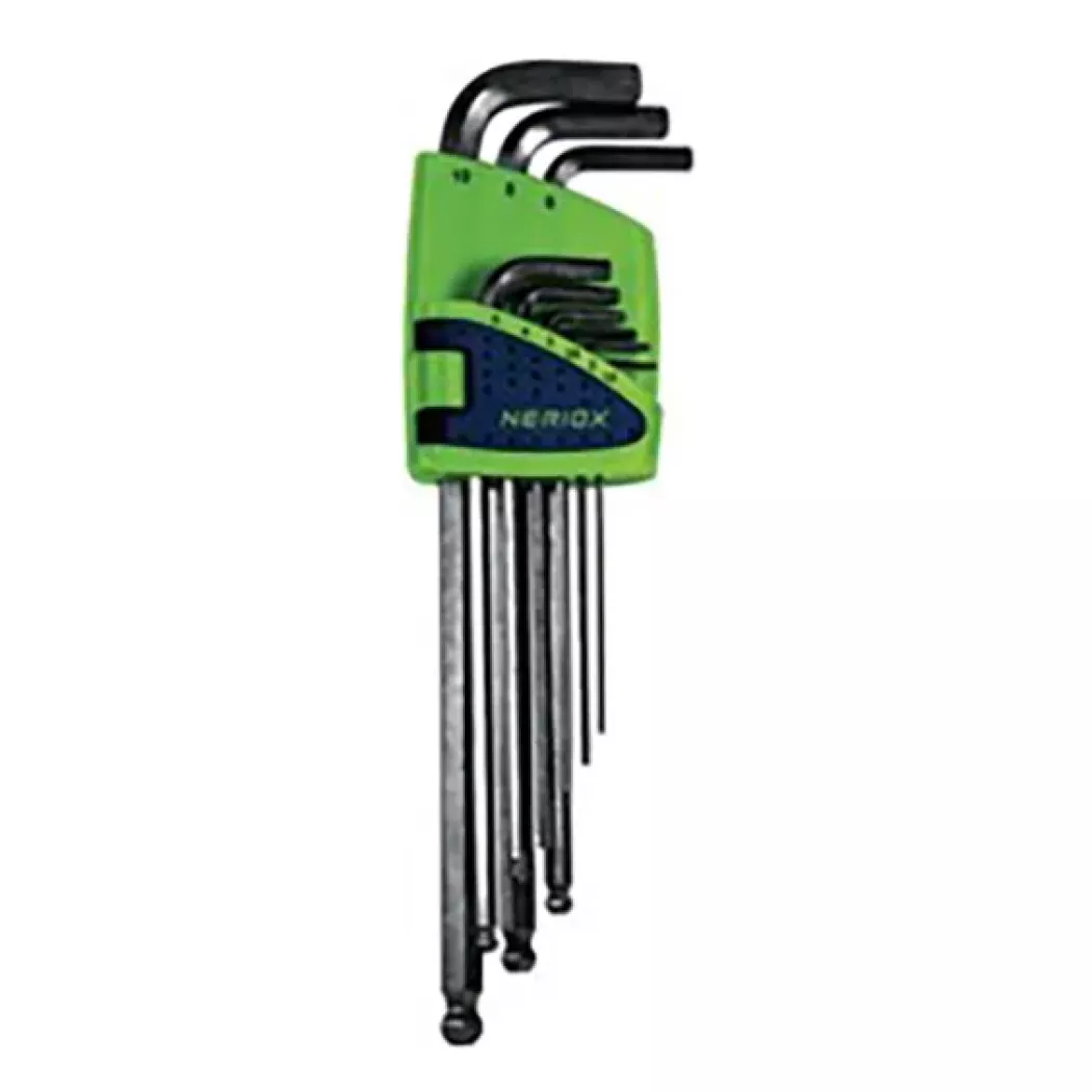 Zestaw długich kluczy imbusowych NERIOX spełniających normę ISO 2936 L zawiera 9 rozmiarów od 1,5 mm do 10 mm. Każdy klucz wykonany z chromowo-wanadowej stali, wykończony satynowo i wyposażony w kulową końcówkę („ball head”) na długim ramieniu, ułatwiającą dostęp do śrub pod kątem. Klucze dostarczane są w praktycznym plastikowym uchwycie.