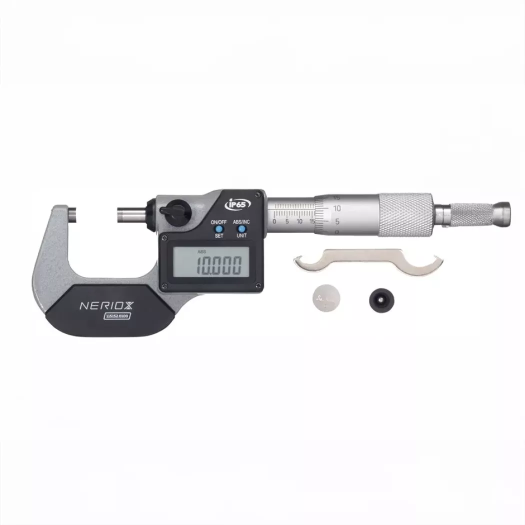 Mikrometr NERIOX MV IP65 to wysokiej klasy przyrząd pomiarowy zaprojektowany z myślą o pracy w trudnych warunkach — zarówno w zakładzie produkcyjnym, jak i w pomieszczeniu warsztatowym. Oferuje zakres pomiarowy 0–25 mm (z możliwością rozszerzenia) z rozdzielczością 0,001 mm oraz klasą ochrony IP65, która chroni przed pyłem i strugą wody.