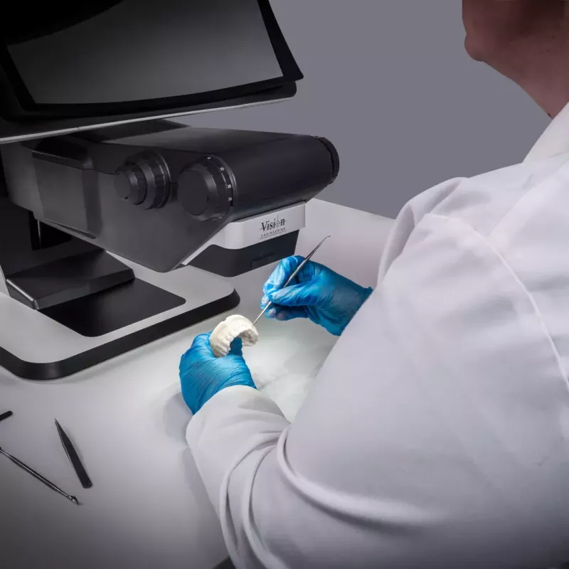 Ergonomiczna konstrukcja DRV-Z1 pozwala na swobodne ruchy głowy, naturalne pole widzenia i pracę w okularach korekcyjnych. System eliminuje napięcie karku i zmęczenie oczu typowe dla klasycznych mikroskopów stereoskopowych.