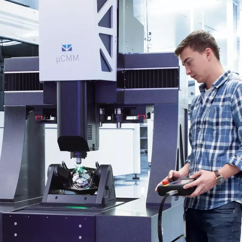 μCMM osiąga dokładność pomiaru poniżej 1 µm w całym zakresie roboczym 310 × 310 × 310 mm. Solidna podstawa z granitu, aktywna kompensacja temperatury i czujniki drgań gwarantują stabilność nawet w środowisku przemysłowym.