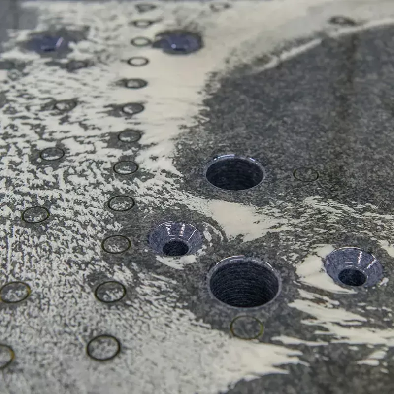 Naturalny gabbro: niemagnetyczny, odporny na korozję, o niskiej rozszerzalności. Tłumi drgania, więc płyta trzyma geometrię w hali i laboratorium.