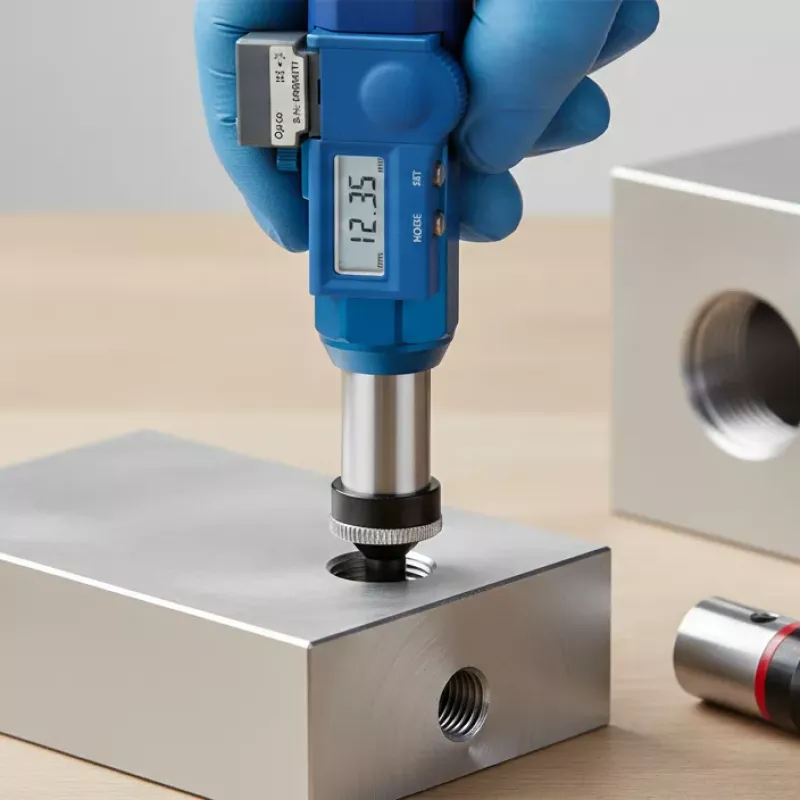 TD-Gauge+ mierzy głębokość i równocześnie sprawdza stan GO/NO-GO. Obsługuje wtyki cylindryczne Ø2–18 mm oraz sprawdziany gwintów M2,5–M18 zgodne z DIN. Skala odczytu jest zawsze widoczna, co przyspiesza kontrolę.