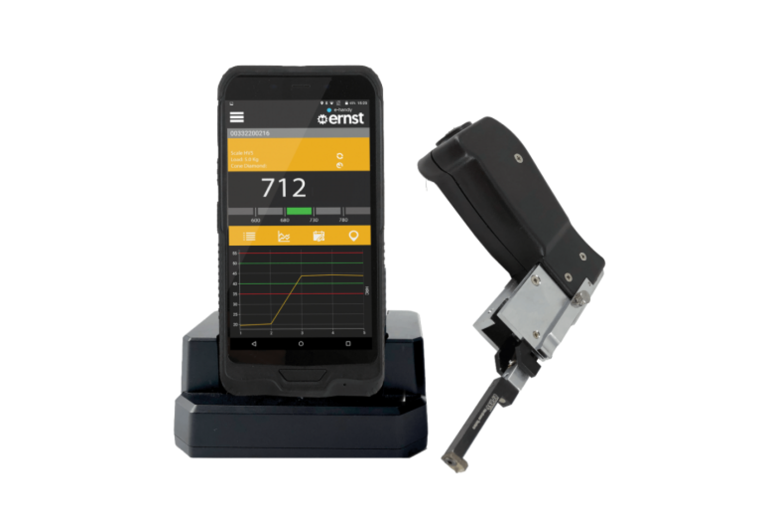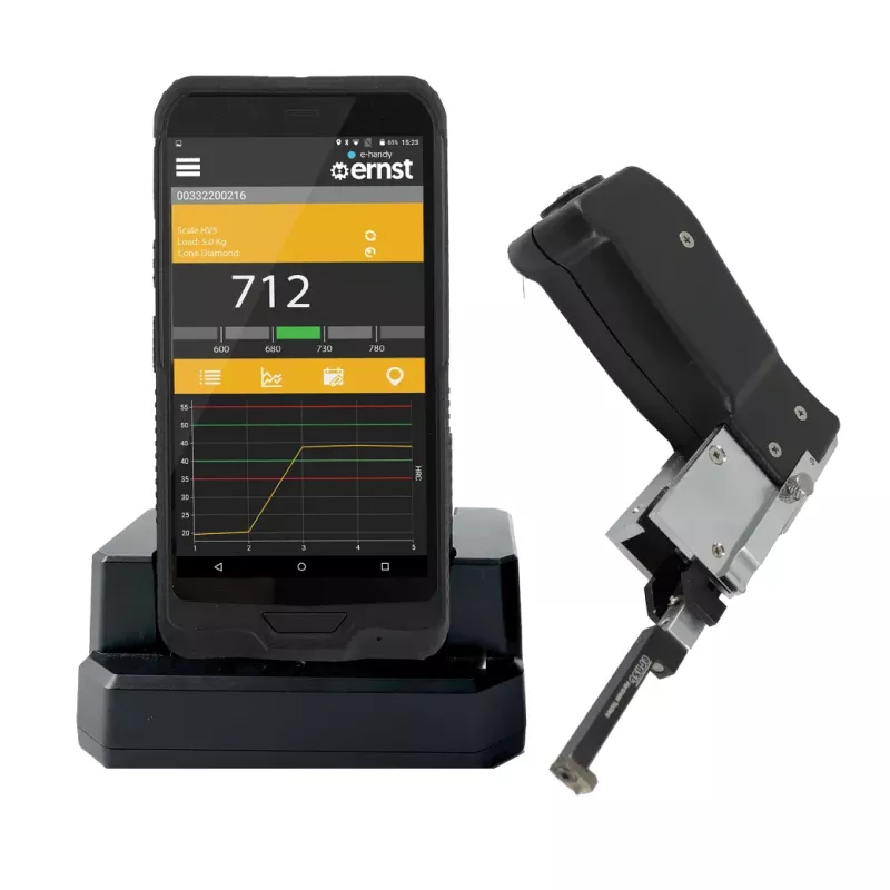 e‑Handy to kompaktowy, bezprzewodowy twardościomierz wykorzystujący opatentowaną metodę ESATEST® opartą na pomiarze oporu elektrycznego, stworzony z myślą o pomiarach w trudno dostępnych miejscach. Umożliwia pomiary na małych powierzchniach, wewnątrz elementów konstrukcyjnych, w strefach wpływu ciepła (HAZ) oraz na złożonych zespołach bez konieczności demontażu. Wyniki pomiaru dostępne są natychmiast, co pozwala na szybką ocenę stanu materiału.