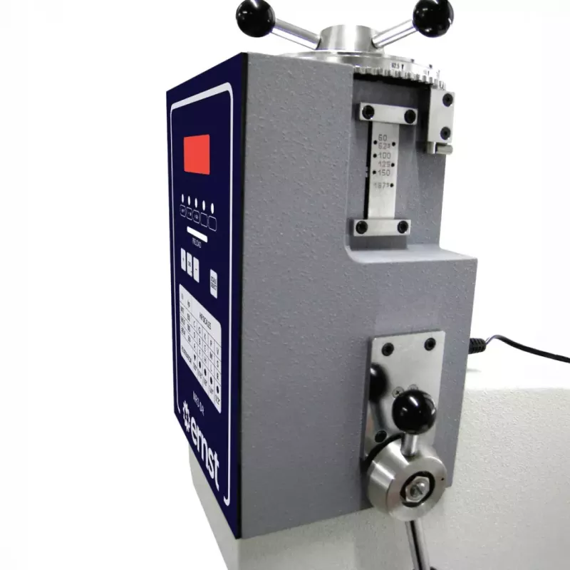 Zmiana obciążenia odbywa się za pomocą pokrętła, a obciążenie aplikowane dźwignią — obsługa jest intuicyjna. Głowice można łatwo wymieniać, a cyfrowy wyświetlacz ułatwia odczyt wartości.